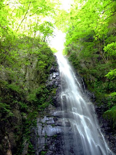 | 百尋ノ滝はやや水量が少ない感じです。百尋ノ滝からは一旦戻り川苔山を目指します。昔、沢の水を飲んだと思われる沢を横切りますが、今はとても飲めそうに有りません。頂上に近づくにつれ日向沢の新緑が鮮やかです。 |