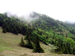 | 道標に従いトイレの裏手から石丸峠への道を下っていきます。廃屋の大菩薩館の前を通り、沢を越えカラマツの多い樹林帯を登ります。途中で林道を2回横切ります。展望が開けたところでは大菩薩湖が見えます。笹原に覆われた石丸峠は明るく開けています。しかし霧が流れて展望はよく有りません。 |