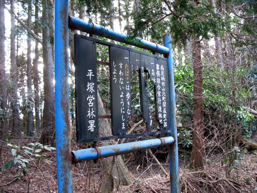 | 右側の捲き道らしい幅広い道を行く。やがて道幅も狭まり気の抜けない山の斜面を歩くようになる。右手に大野山のカヤトに覆われた優しい山容や東名高速道路などが望める。赤い実をつけたアオキの多い緩やかな道を更に進むと、小さなカヤトがありその先に平塚営林署の看板がある。これでようやく正しいルートを歩いていると確信する。 |