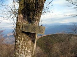 | 鳥手山の右斜面を巻くようにして進む。雰囲気の良い明るい尾根道があり好ましい。鷹落場への登りは踏み跡が薄くなり、ルートを外したような感じだったが、とにかく尾根伝いに高みを目指す。ようやく作業道らしき道がでてきて左斜面を巻きながら進む。右からの尾根に合わさり右に進むと鷹落場の山頂に達した。二等三角点の石柱と建設省国土地理院の白柱が立っており、近くの木には鷹落場の標識が付けられていた。南側にはこれから登る矢倉岳が望まれた。 |