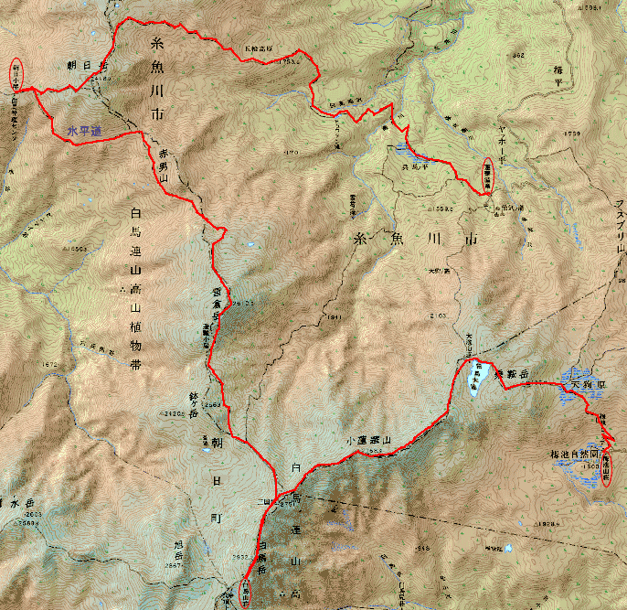 朝日小屋5:00→6:00朝日岳6:20→6:50栂海新道分岐→8:20五輪ノ森→8:25青ザク→9:00花園三角点→10:00白高地沢→11:40兵馬ノ平→12:10分岐→12:25蓮華温泉(バス¥1,180+荷物料金¥310)14:10~大糸線平岩駅~南小谷駅~信濃大町駅~松本駅~甲府駅~高尾駅 |