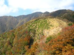 | 稜線の笹原と紅葉する木々が谷筋まで降りていっているのが見える。塔ノ岳へ戻り大倉尾根への道を進む。途中、谷筋が紅葉で埋まっているのが見える。 |