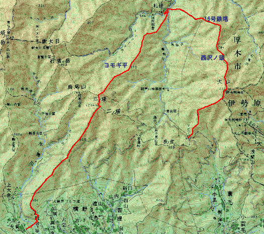 | ヤビツ峠~大山~札掛~ヨモギ平~三ノ塔~大倉へのコース断面図 | |||||||||||||||||||||||||||||||||